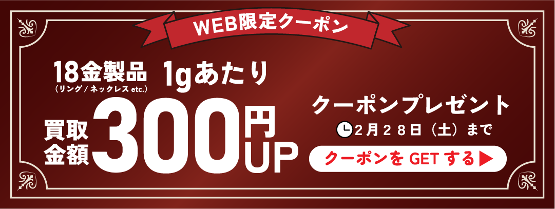 WEB限定クーポン配信。11月30日までに査定成立でK18製品1gあたり300円UP。リング・ネックレス・ブレスレットなど対象。今すぐブックオフ三宮センター街店へ。