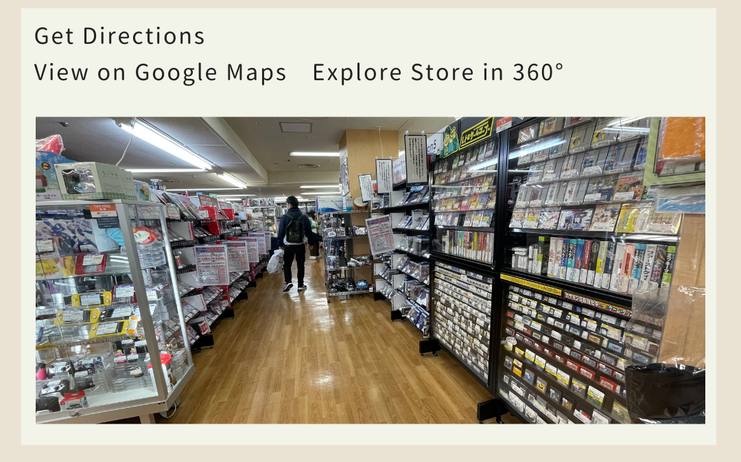 This is a 360-degree interactive view of our actual store interior in Sannomiya, Japan.You can explore the aisles, displays, and atmosphere before visiting.The store offers a wide selection of Japanese second-hand items, including anime merchandise, games, collectibles, and vintage goods.