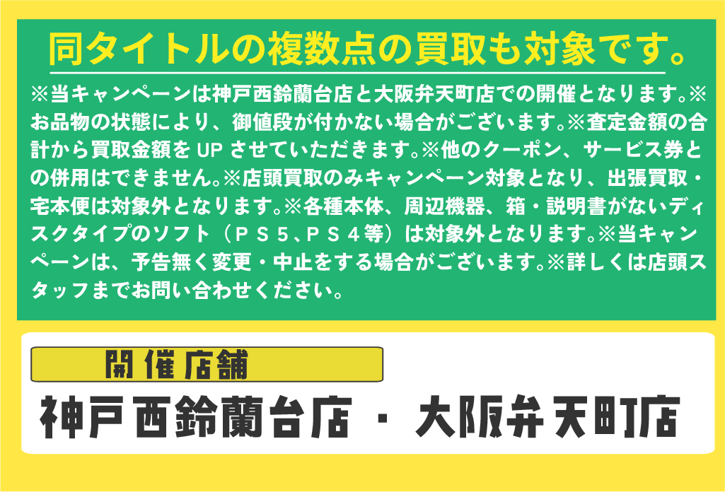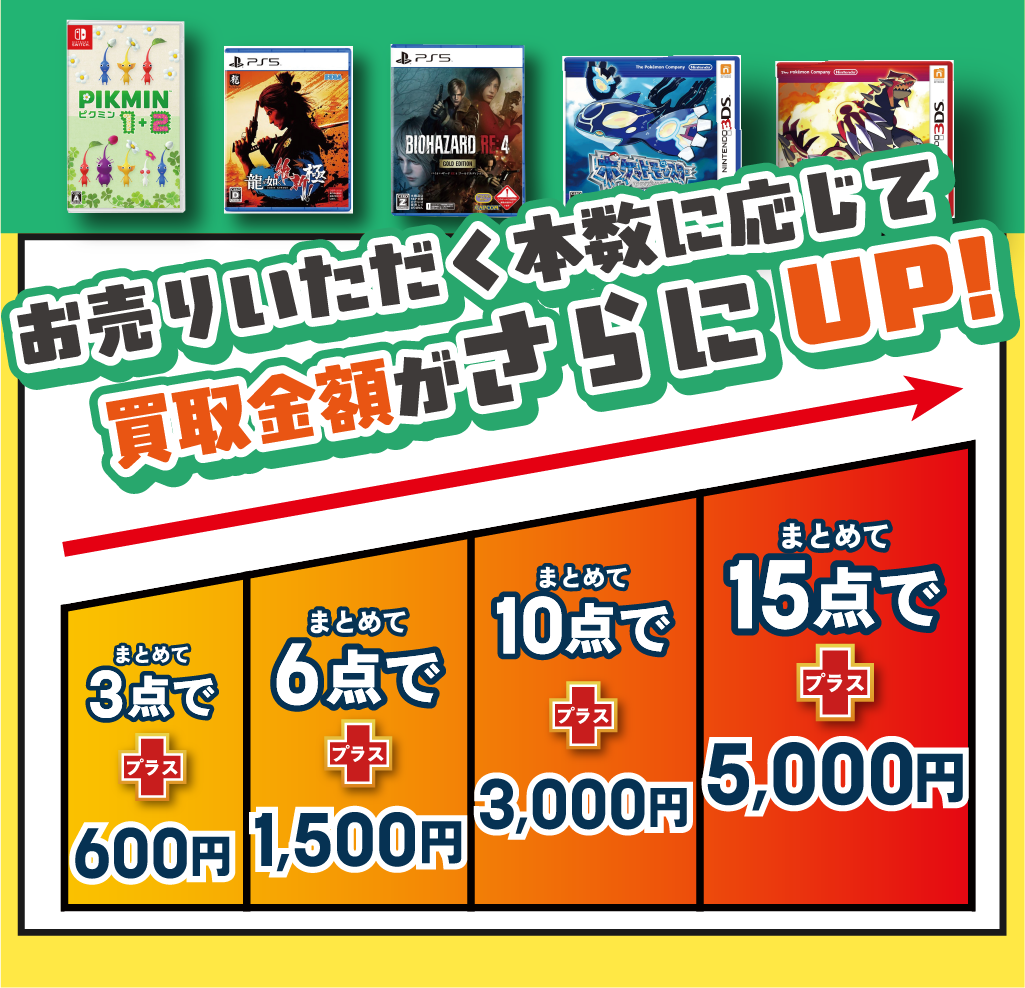 ゲームソフトまとめ買取キャンペーン|大阪弁天町店|神戸西鈴蘭台店|最大15点で5,000円UP